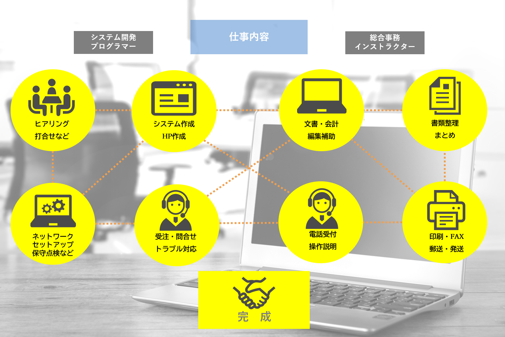 事務、書類整理、電話受付 インストラクター(ソフトウェアの操作説明、電話サポート) |